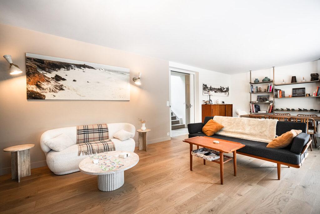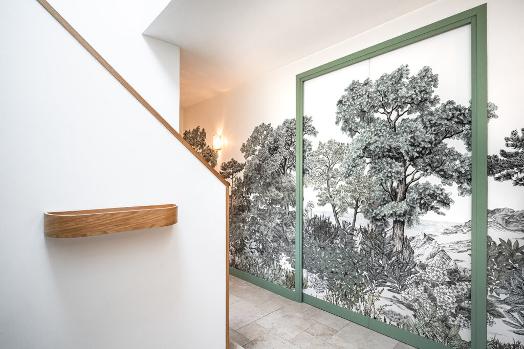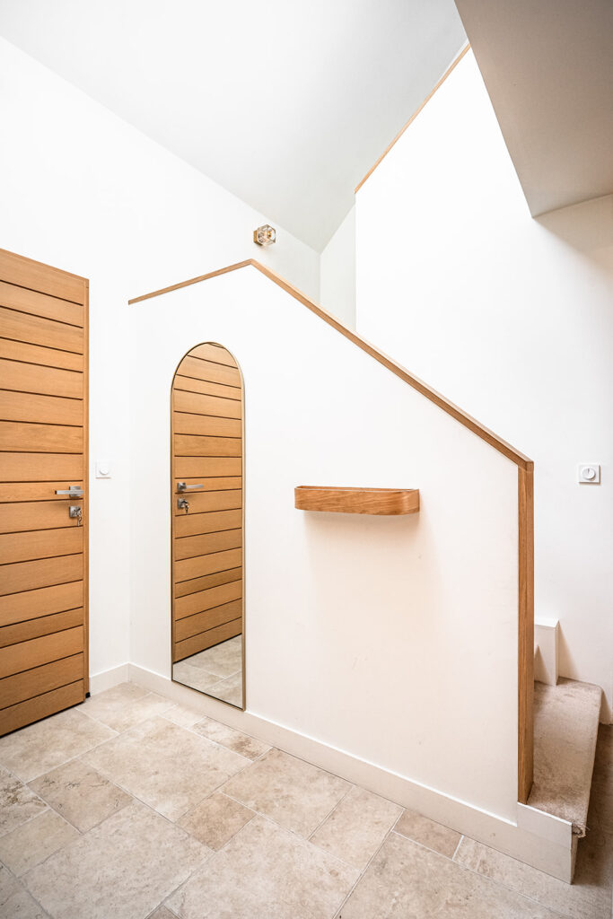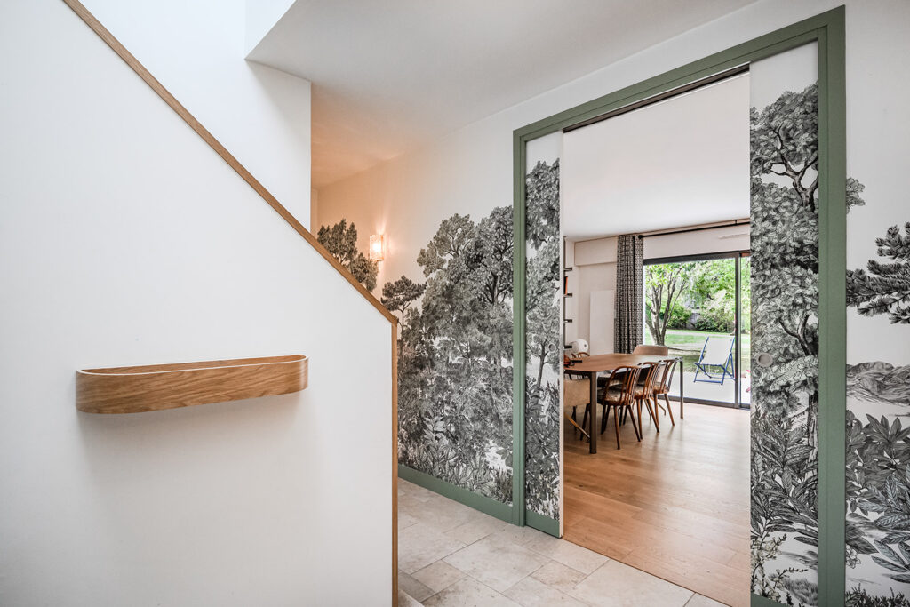 Nous avons récréé de nouveaux volumes fonctionnels et répondant au cahier des charges de cette famille avec 3 adolescents. Nous avons réalisés tous les plans techniques et avons fait la coordination de la rénovation totale et globale de cette maison. La décoration mêlant le côté authentique (sol en travertin, éléments en bois…) aux teintes et matériaux cosy et végétales (moquettes beiges, mur crèmes, papier peint panoramiques Isidore Leroy…) s’additionnent à des pièces de choix Vintage et raffinés.